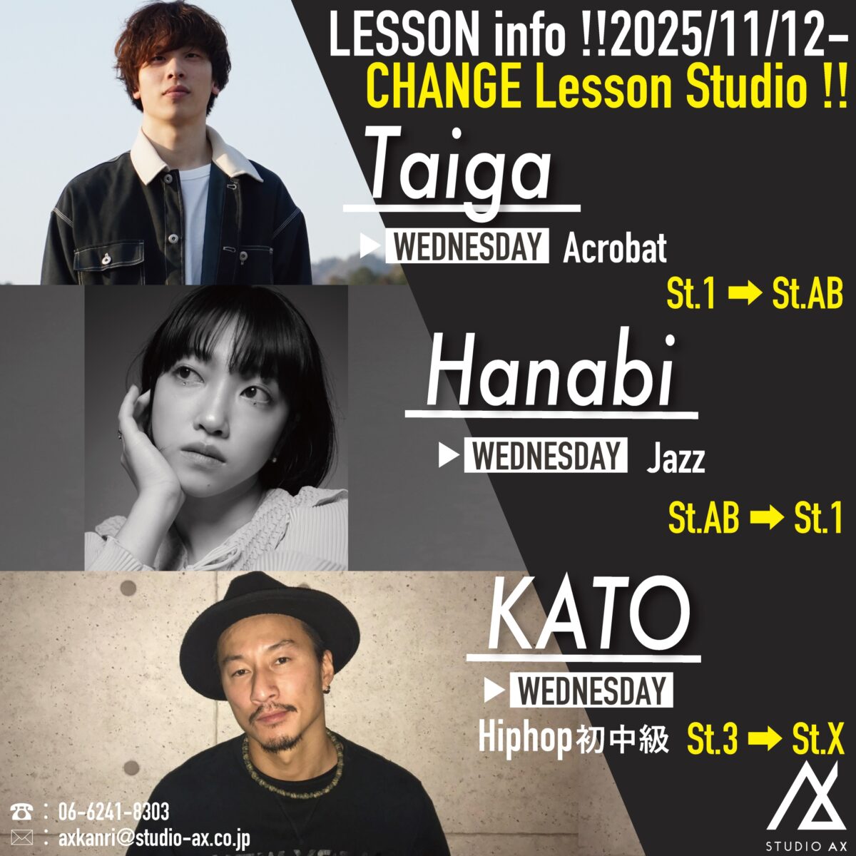 💎2025/11月12日〜 Taiga / Hanabi / KATO クラスレッスンスタジオ移動のお知らせ💎