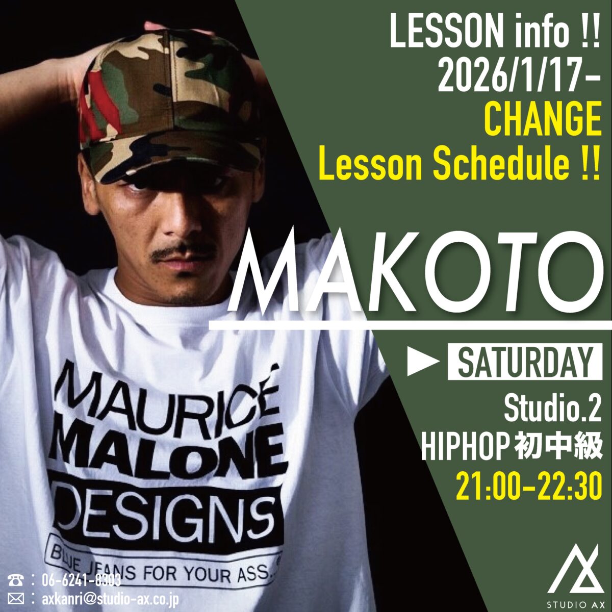 現在、土曜日21:30〜23:00でLessonしておりますMAKOTO先生のHiphop初中級クラスのレッスン時間が変更になります!