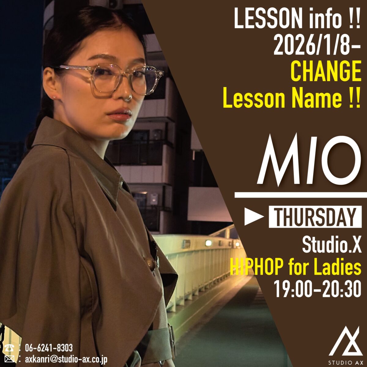 現在、木曜日19:00〜20:30でLessonしておりますMIO先生のGirlsHiphopクラスのレッスン表記が変更になります!