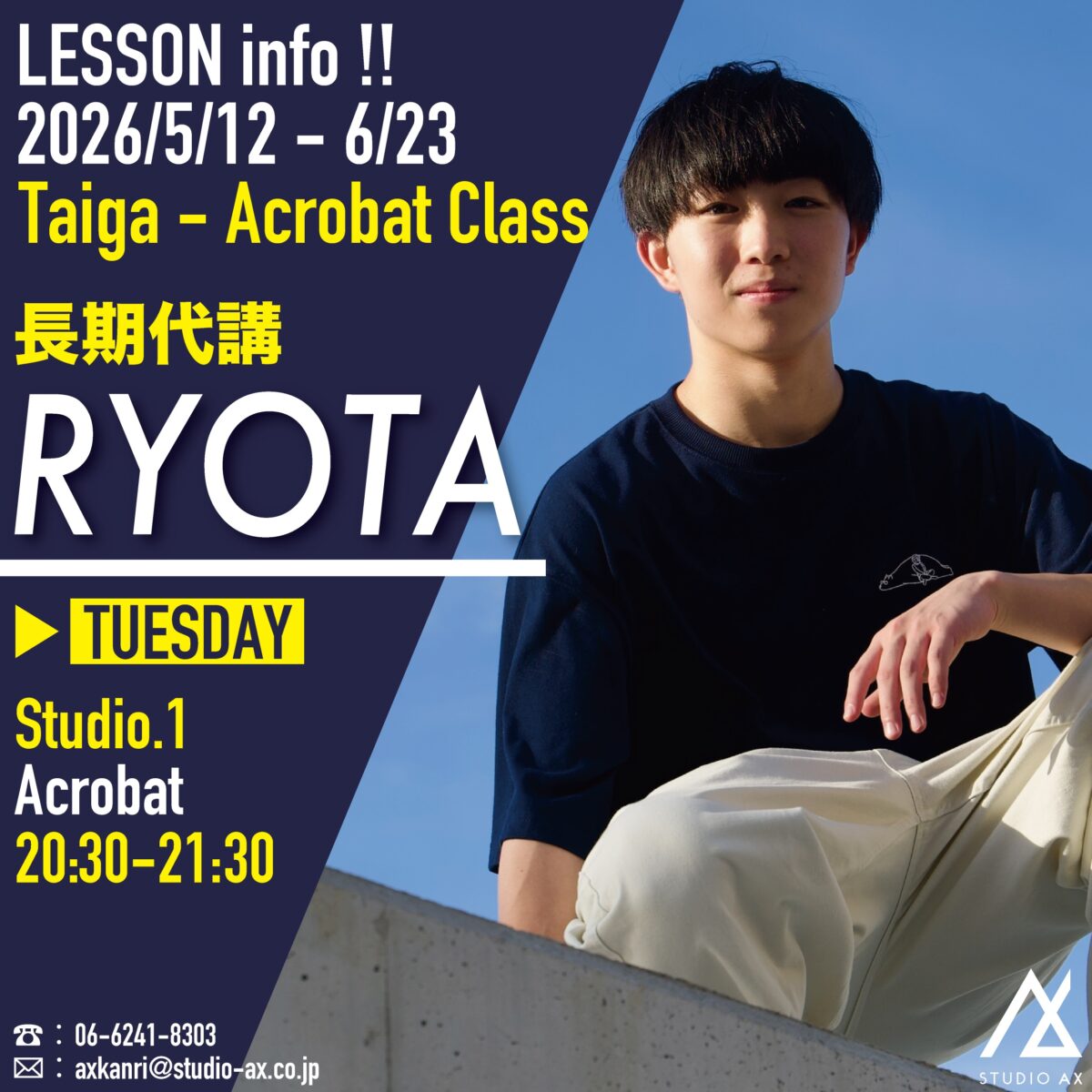 現在、水曜日19:00〜20:00でLessonしておりますTaiga先生のAcrobatクラスのレッスン時間が変更になり、長期代講となります!